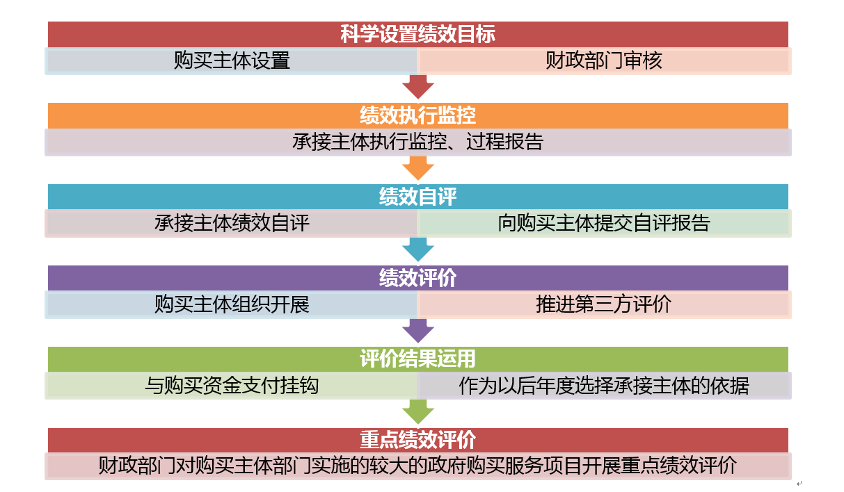 暂行办法虽然对绩效管理亦有提及,但寥寥数语,未尽详明。这次意见稿就“绩效管理”单设一章,明确了绩效管理的具体操作路径,推动全过程绩效管理机制的形成,具体如下图所示:
