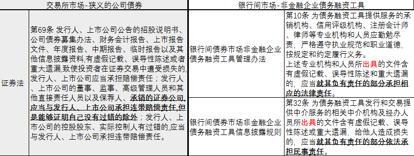 笔者倾向于认为,交易所市场的狭义公司债券和银行间市场的非金融企业债务融资工具本质上并无区别,都属于广义的公司债券,承销商承担的责任应当是对等的,既然狭义公司债券的承销商与发行人就募集说明书的真实性承担连带责任,非金融企业债务融资工具的承销商也应当承担连带责任。此外,若将债券交易视为普通的买卖合同,发行人为生产商,承销商为销售者,债券为商品,投资人为消费者,若商品有瑕疵(债券违约),消费者(投资人)既可以向生产者(发行人)索赔,也可以向销售者(承销商)索赔。更何况,承销商不仅销售债券,承销商实质上参与了债券的生产(注册、发行),理应与发行人承担同等责任。