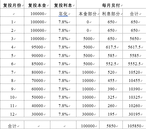 举例:如已经兑付3期,则在第四期剩余本息全额兑付。