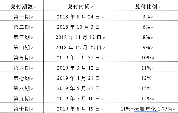 前3个月每月兑付1%,第4—6个月每月兑付2%,第7—9个月每月兑付2.5%,第10—12个月每月兑付3%,第13—15个月每月兑付3.5%,第16—18个月每月兑付4%,第19—21个月每月兑付4.5%,第22个月兑付10%,第23个月兑付13. 5%,第24个月兑付15%全部清兑完毕。