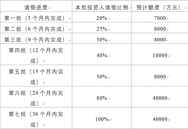 (三)兑付过程优先考虑每位投资人的投资本金,完成全部本金返还后,将以银行同期活期利率标准于第四年开始支付利息(每自然年的首日剩余本金记当年付息核算基数),该工作将于2021年7月31日以前完成。