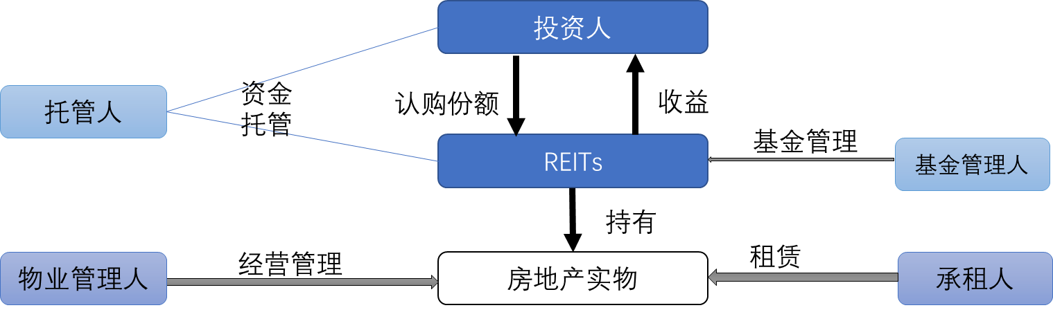 REITs 的基本原理是由一家信托投资基金持有房地产,投资者通过认购基金份额来参与房地产项目的投资,通过房地产项目经营收益分红或者流转差价获得收益,投资项目的资金应被托管于独立的第三方,房地产本身的经营管理则由专门物业公司来进行。简要图示如下: