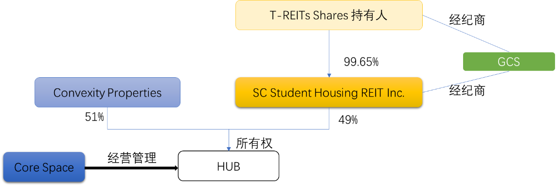 根据资产证券化交易平台HARBOR的介绍:The Hub at Columbia是位于美国南加州大学附近的学生公寓,共有260套房间,由专门的物业管理公司Core Space经营管理,价值约2000万美元。该学生公寓的原所有人为Convexity Properties,系DRW旗下的房地产投资企业。2018年11月,该学生公寓中约49%的权益实现Token化。大致方案如下:由投资基金SC Student Housing REIT Inc.(以下简称“SC”)持有学生公寓约49%的权益,对应分割为995份T-REITs份额,相当于占SC99.65%股权的普通股股票,每份售价2.1万美元,接受的支付方式包括美元、比特币和以太币。投资者通过FINRA注册经纪商Growth Capital Service获得交易文件并认购。该T-REITs份额于2018年11月27日起出售,90天后可以在美国合格投资人之间通过区块链转让;1年后,可以转让给非合格投资人。所有交易受限于所适用的证券法规和REITs交易法规。[2]