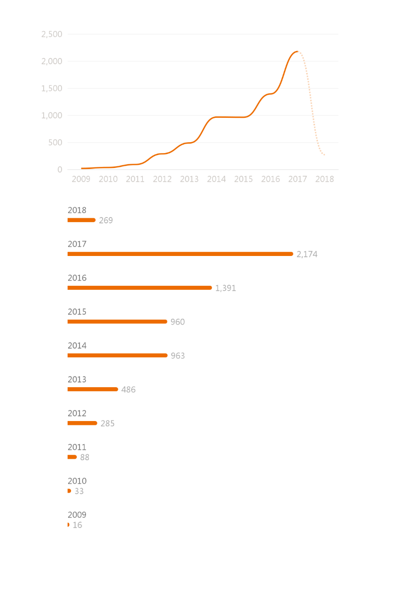 通常而言,计算机软件版权侵权、网络游戏版权侵权、网络版权侵权,已经成为版权侵权的主要表现形式。同时,“恶意规避技术措施”类型计算机软件侵权,也已经成为著作权侵权案件的主流。使用Alpha数据库进行大数据分析可以得知,2009-2018年这十年间,“恶意规避技术措施”类型计算机软件侵权案件共计7806件,同时每年保持增长趋势,2015年、2016年、2017年分别达到960件、1391件、2174件。