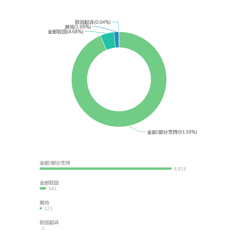 从“恶意规避技术措施”类型计算机软件侵权的结果分类情况可以看到,全部/部分支持原告诉讼请求的一审案件有6819件,占比为94%;全部驳回原告诉讼请求的有341件,占比为5%;其他的有123件,占比为2%。可见,“恶意规避技术措施”类型计算机软件侵权案件的原告胜诉率非常高。