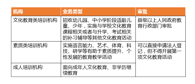 由此可见,虽然在现行教育法律法规体系下从事培训业务的培训机构均需向教育部门申请办学许可证,但目前的监管环境同送审稿所体现出的分类领证趋势似乎一致,针对青少年开展的学科类、文化教育类培训的管制趋势愈加从严,禁止未取得办学许可证的机构从事该等业务,而对于素质类培训机构和成人培训机构却存在着“简政放权”,免除审批,开放市场登记的可能性。