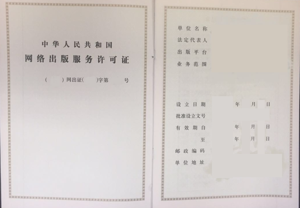 申请《网络出版服务许可证》的,需要先向其所在地省、自治区、直辖市出版行政主管部门提出申请,经审核同意后,由国家新闻出版广电总局审批。《网络出版服务许可证》有效期为五年,期满前60日可以继续申请换发新的《网络出版服务许可证》。该许可证的正副本样本分别如下图所示: