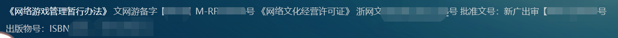另外,对于移动游戏而言,根据《关于移动游戏出版服务管理的通知》第八条:移动游戏上网出版运营时,游戏出版服务单位应负责游戏内容完整性,须在游戏开始前、《健康游戏忠告》后,设置专门页面,标明游戏著作权人、出版服务单位、批准文号、出版物号等经国家新闻出版广电总局批准的信息。以下某游戏截图中最底端所示即为备案电子标签的示范。