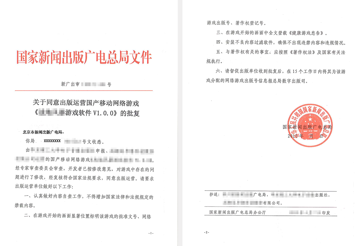 获得国家新闻出版广电总局审批之后的批复文件中标明的批准文号即该游戏的文号,其文件样本如下图所示: