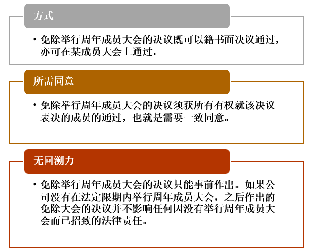 实践中,公司可以籍通过决议的方式免除举行周年成员大会: