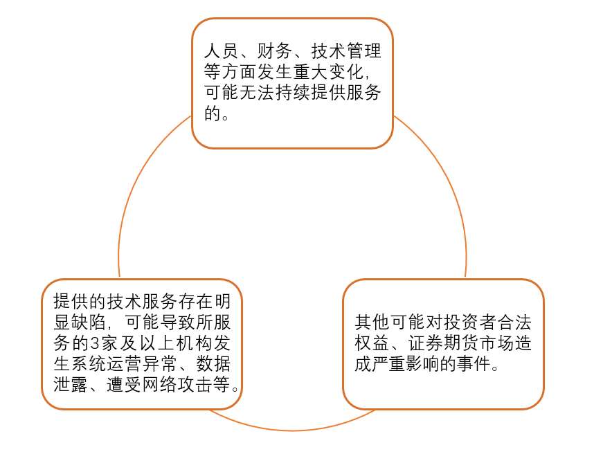 此外,《办法》第55条要求,当信息技术服务机构出现以下情形时,应当立即报告住所地中国证监会派出机构: