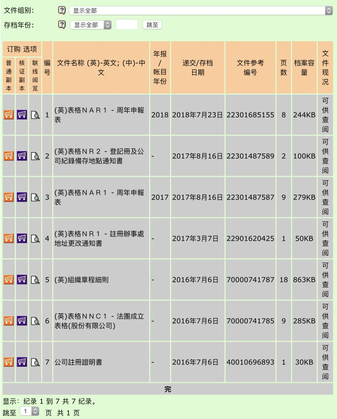 除了成立相关文件和周年申报表之外,当公司的基础资料和重要方面发生变更,公司必须在限期内填妥相关表格并到公司注册处进行登记。这些表格会出现在公司注册处的公开资料中,可供公众付费查阅。某公司的公开资料列表如下图所示: