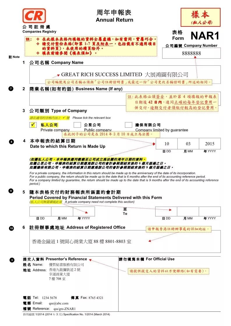 周年申报表中需要填写的各项分别为:公司名称、商业名称、公司类别、本申报表日期、注册办事处地址、电邮地址、按揭及押记、无股本公司的成员数目、股本、有股本公司的成员详情、秘书、董事、登记册、随本表格提交的账目所涵盖的会计期和证明书。 上述各项如不适用,填入N/A即可。 |