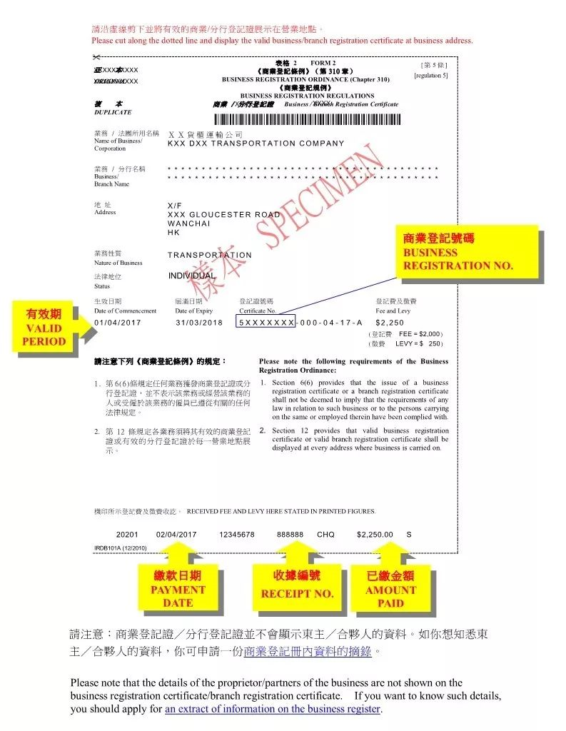 商业登记证的有效期通常为1年或3年,目前对应的应缴金额分别为$2250和$5950。在商业登记证有效期届满前约一个月,商业登记署会发出商业登记证缴款通知书,一经付款,该缴款通知书即成为新的有效商业登记证。如果直至商业登记证届满仍未收到缴款通知书,可以携旧商业登记证直接到商业登记署换领商业登记证,或以邮递旧商业登记证复印件及划线支票的方式换领,或在届满后的一个月内书面通知商业登记署。