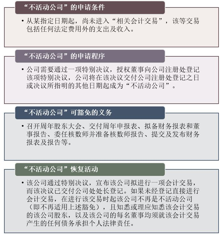 如果持有的香港公司本身没有业务,只是用于持有资产(包括股份、不动产等等),或只是提前注册公司名称,拟供日后使用,可以通过申请将公司列为“不活动公司”的方式,免除部分合规义务,降低维护公司的成本。“不活动公司”的相关规定总结如下: