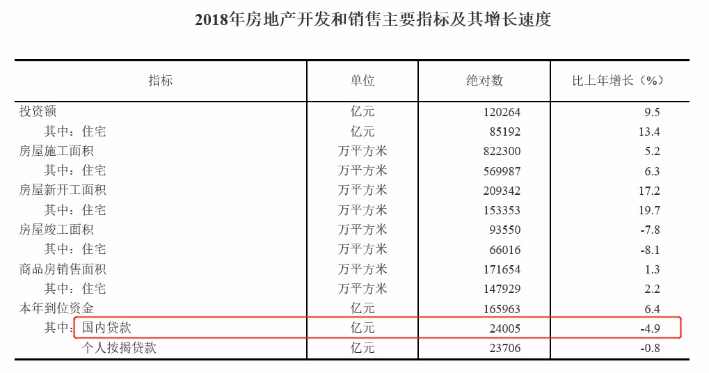 根据国家统计局对房地产开发和销售主要指标及其增长速度的统计,2018年度我国房地产企业在本年到位资金、国内贷款、个人按揭贷款数据均呈负面发展态势,房地产企业资金到位相对乏力。