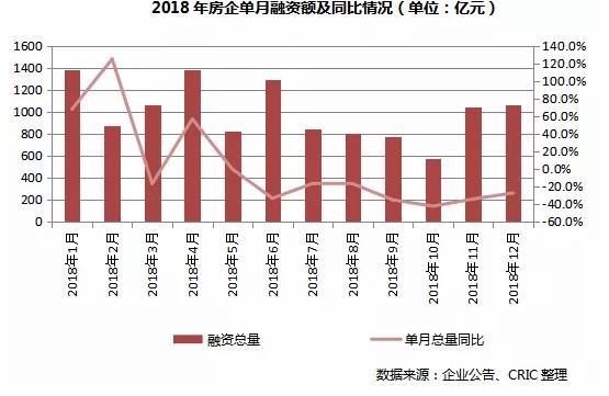 根据CRIC大数据,2018年房地产企业单月融资额及同比情况显示即使是在2018年内各月份,整体融资额同比仍呈下降趋势。