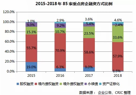 根据德勤统计报告,在境内资本市场的IPO融资额方面,房地产企业在2017年及2018年中融资总额显著低于其他主要行业类别,并在2018年呈现持续下降趋势。面临融资到位情况逐年恶化的现状,部分房地产企业不得不试图将融资渠道进一步拓展,特别是进行境外融资。由下图可以看出,境外债权融资在85家重点房企的融资渠道中所占的比例逐年扩大。