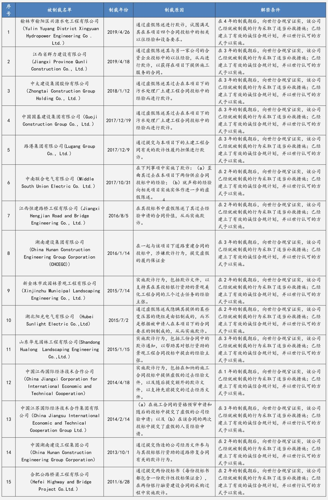 我们整理了世行公开披露的中国企业受制裁原因及解禁条件。可见,统计范围内的中国企业违规行为往往集中在投标环节的虚假陈述等,而建立并实施有效的诚信合规体系则无一例外地成为世行解禁条件。