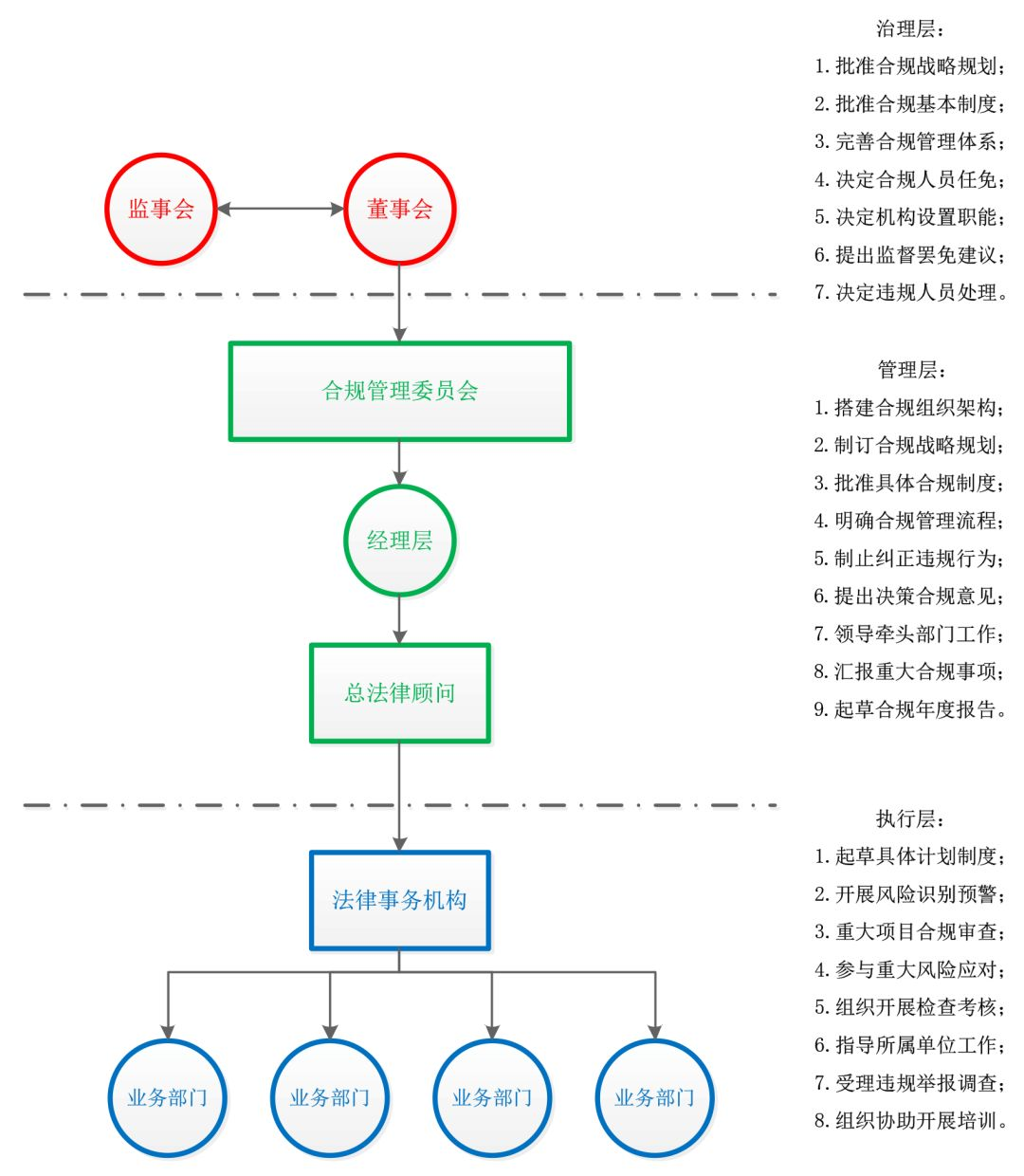 1. 区分决策、管理、执行三个层级的合规管理责任。(第10条)