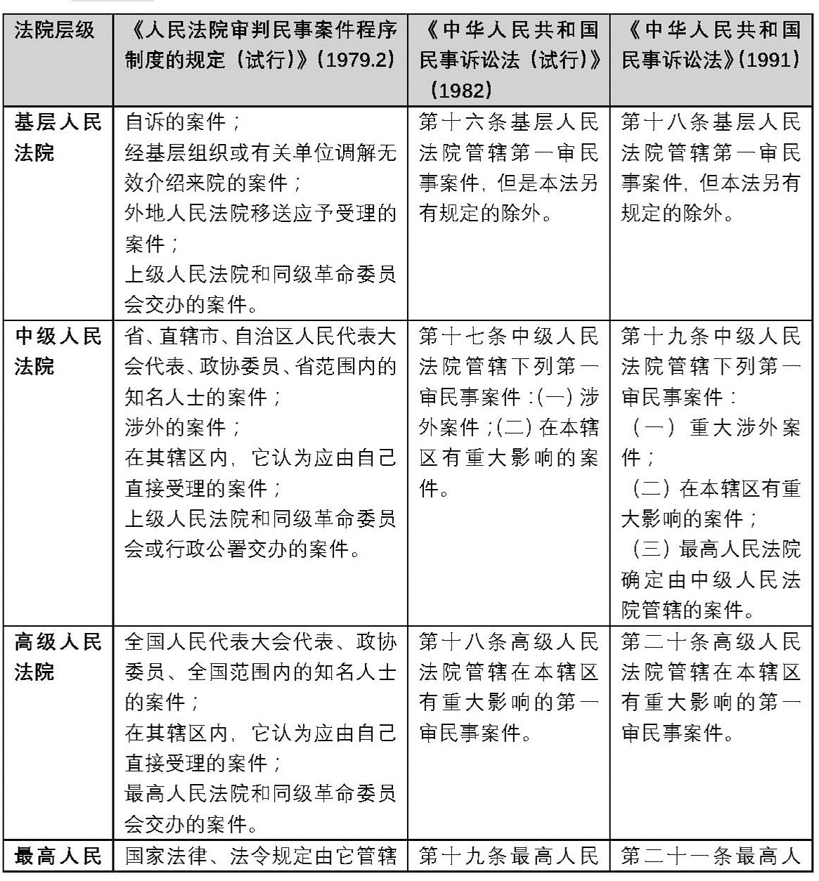 新中国的民事诉讼法,应溯源至1978年中共中央第十三次全国党代会,中共中央确定并提出了加强社会主义民主与法制建设。自此之后,新中国的诉讼制度全面开始了变革、创新之路。纵观级别管辖的历史变迁,能够发现主线为纠纷解决中心的不断下移。