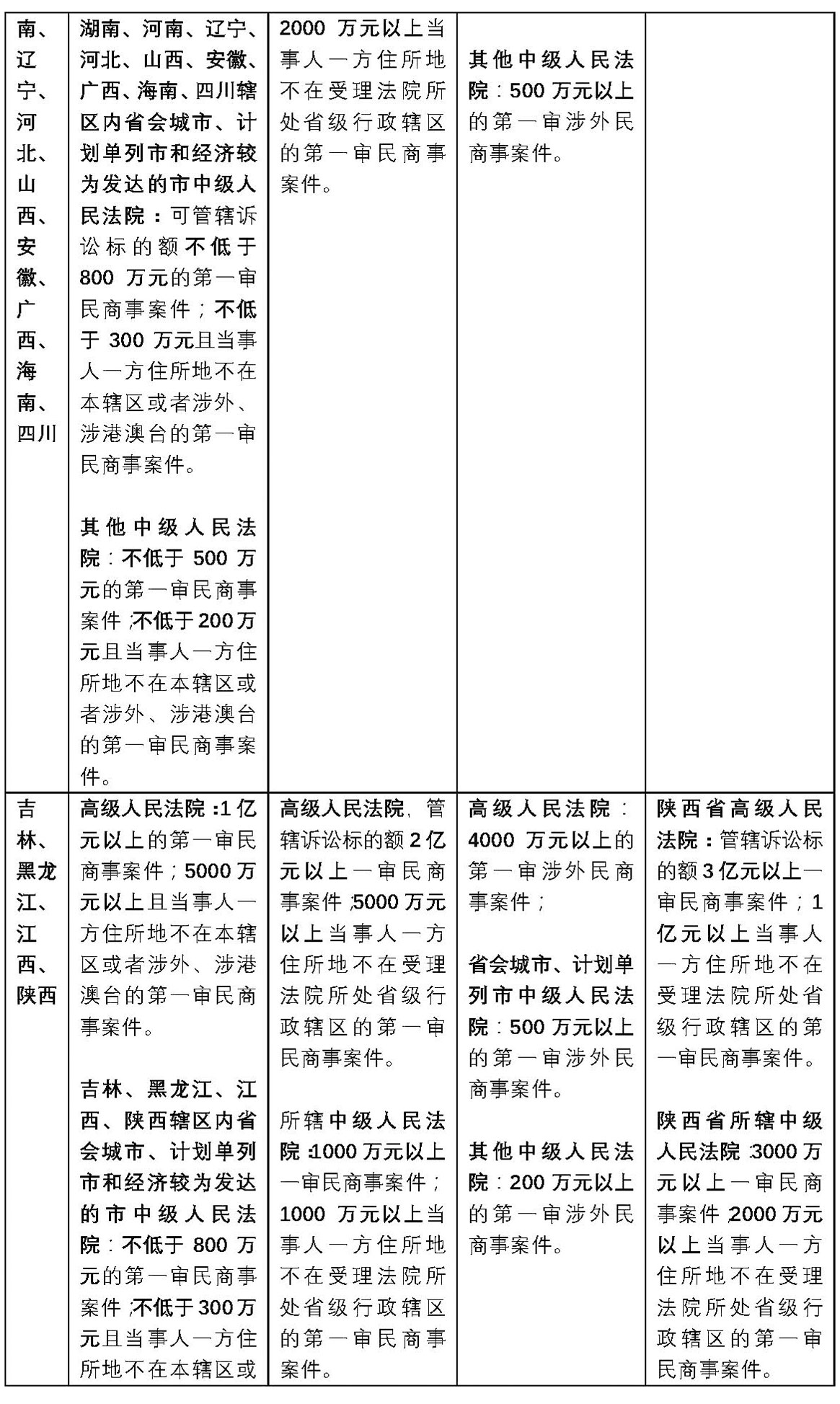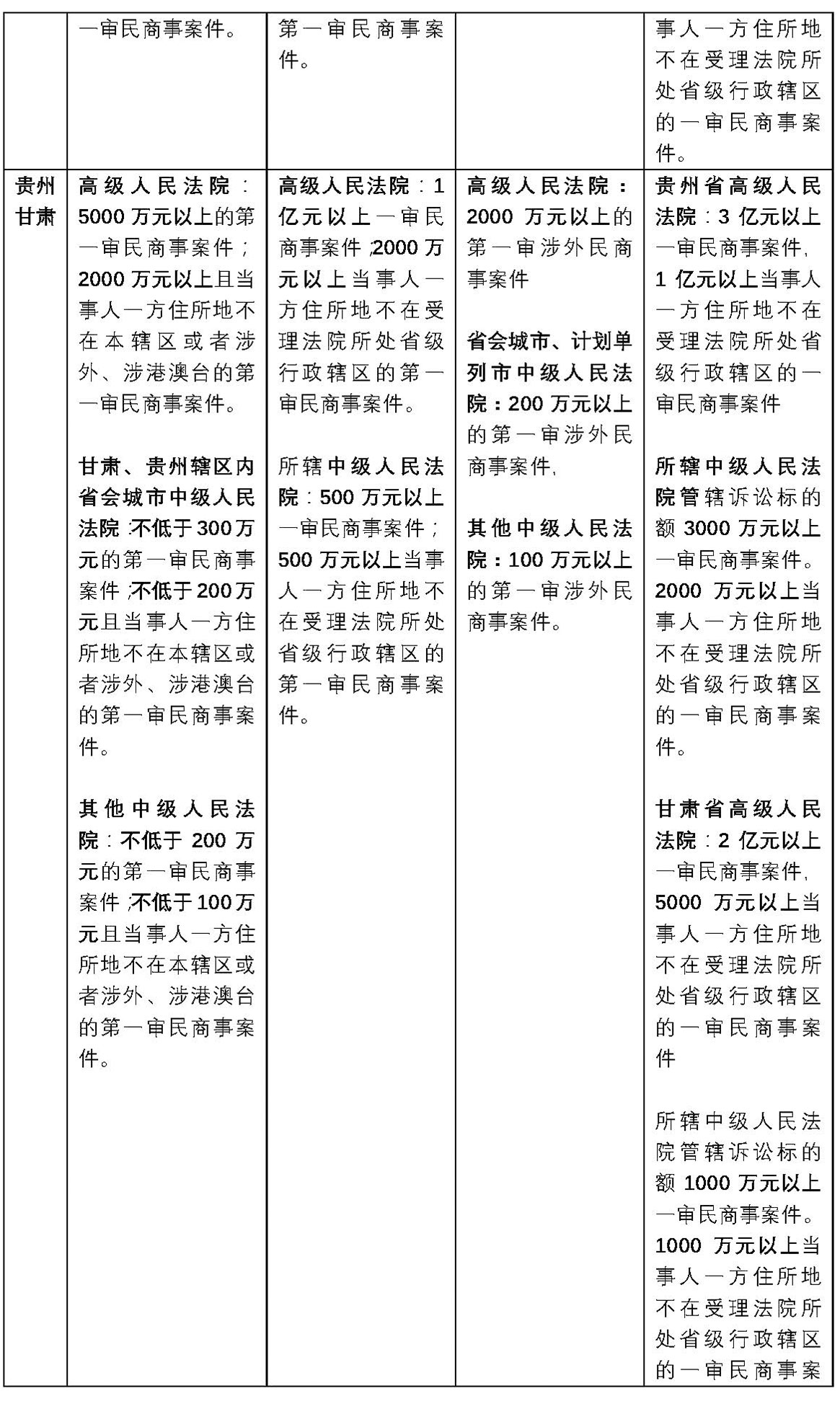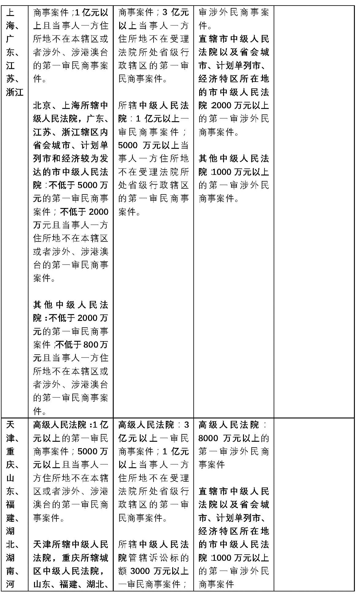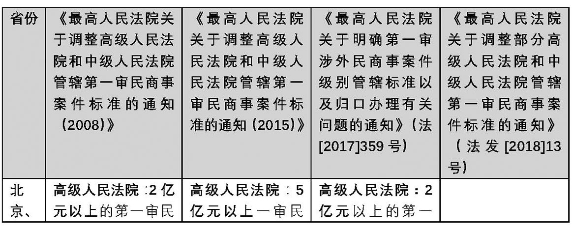除法律外,最高人民法院先后数次以通知的形式(《最高人民法院关于调整高级人民法院和中级人民法院管辖第一审民商事案件标准的通知(2008)》、《最高人民法院关于调整高级人民法院和中级人民法院管辖第一审民商事案件标准的通知(2015)》),明确和调整了各地高级人民法院及中级人民法院的管辖范围,其中2015年的通知主要是对2008年通知管辖范围的提高。2017年,最高院专门调整了涉外民商事案件的级别管辖标准,即《最高人民法院关于明确第一审涉外民商事案件级别管辖标准以及归口办理有关问题的通知》(法[2017]359号),2018年最高院专门调整了部分省份的管辖,也是金额的提高,即《最高人民法院关于调整部分高级人民法院和中级人民法院管辖第一审民商事案件标准的通知》(法发[2018]13号)