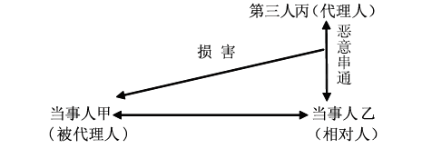 而对于代理人和相对人恶意串通行为,则属于“不真正的恶意串通”。因为尽管有代理人的介入,法律行为的当事人还是被代理人与相对人,串通的是代理人和相对人,损害的却是被代理人。换言之,这里并不是法律行为当事人恶意串通损害第三人的利益,而是法律行为一方当事人与第三人(另一方代理人)恶意串通,损害另一方当事人的利益。