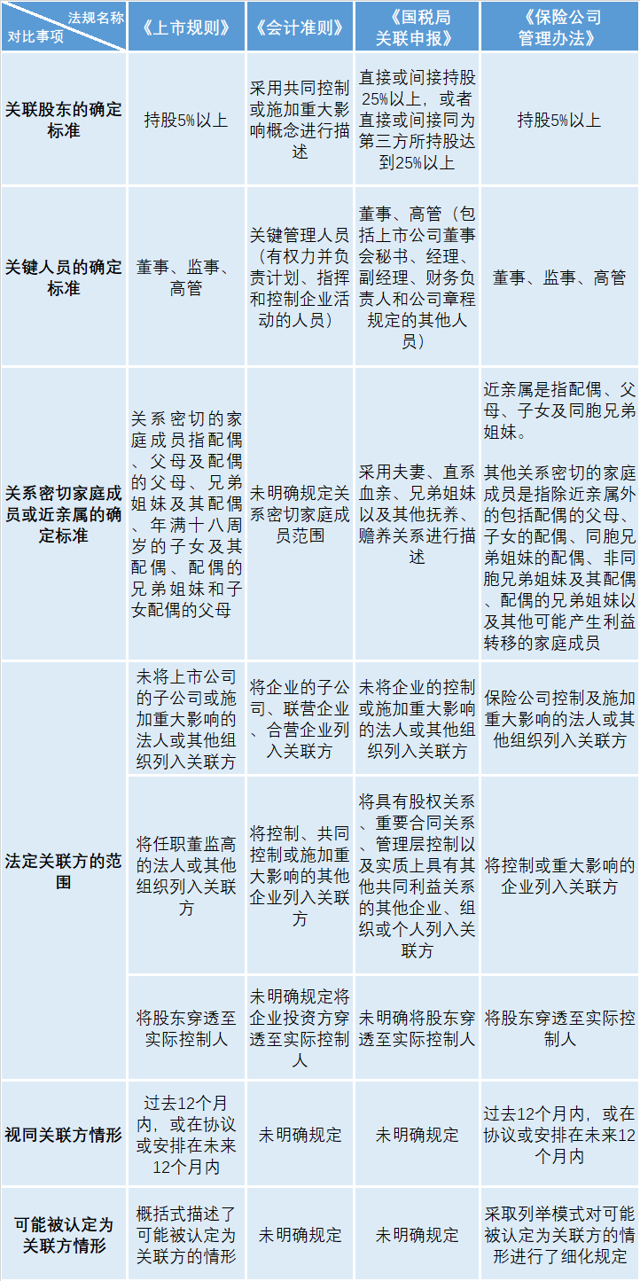 关联交易系信息披露的重要事项之一,而关联方界定系判定关联交易的前提基础,目前关于关联方界定的主要法规包括《深圳证券交易所股票上市规则》《上海证券交易所股票上市规则》[1](以下统称为“《上市规则》”)《企业会计准则第36号—关联方披露》(以下简称“《会计准则》”)《国家税务总局关于完善关联申报和同期资料管理有关事项的公告》(以下简称“《国税局关联申报》”)《保险公司关联交易管理暂行办法》(保监发〔2007〕24号,以下简称“《保险公司暂行办法(已废止)》”)《中国保监会关于进一步规范保险公司关联交易有关问题的通知》(保监发〔2015〕36号,以下简称“《规范保险公司关联交易通知(已废止)》”)《保险公司关联交易管理办法》(银保监发〔2019〕35号,以下简称“《保险公司管理办法》”)等,但鉴于该等法规对关联方的认定标准不一,因此,为进一步明确关联方的认定范围,现就不同法规体系下关联方识别、认定进行梳理。