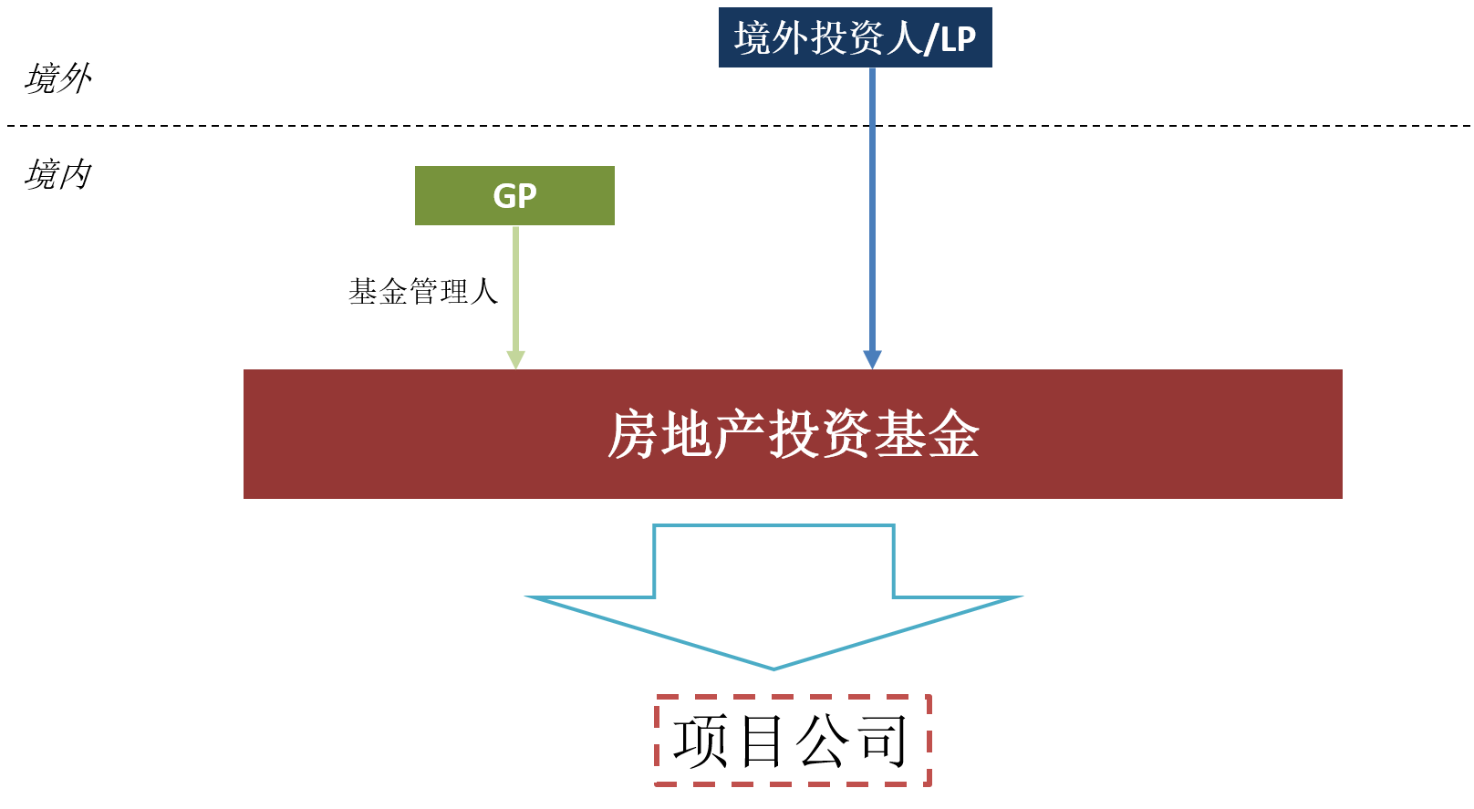 28号文出台后,外资设立境内控股平台即可采用非投资性外商投资企业,极大程度地减轻了境外投资人的负担,对一些原本未达到QFLP准入门槛的外资机构亦开启了投资窗口。综上,QFLP制度作为过去特定环境下的产物,在现有政策的不断革新的背景之下,其已逐步失去了对境外投资人的吸引力,或将逐步退出历史舞台。外资今后可直接通过参与设立基金等形式参与投资境内房地产公司股权,参考架构如下: