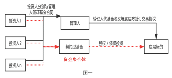 当然,应意识到有限合伙型基金中管理人同时作为普通合伙人存在时,其与投资人[2]之间亦存在共同投资关系。且在有限合伙型基金组织形式下,基金不再如契约型基金一般仅作为资金集合体形态存在(契约型基金的基本构造参见如下图一),其还具备法律意义上的主体形态即有限合伙企业。
