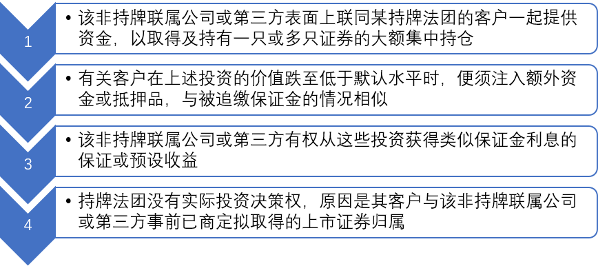 在证监会对保证金交易的严格监管背景下,出现了一些“以投资作掩饰的证券保证金融资”。证监会2018年8月3日《致持牌法团的通函:以投资作掩饰的保证金融资活动》(SFO/IS/045/2018)指出,部分进行资产管理活动的持牌法团,可能曾协助及教唆非持牌联属公司或第三方提供以投资作掩饰的证券保证金融资。该等保证金融资安排具有以下特征: