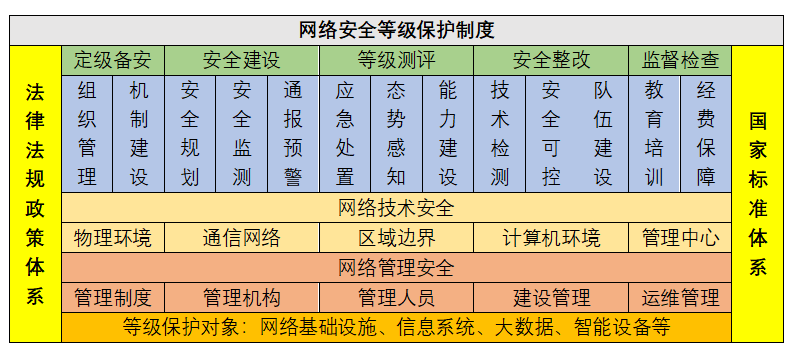 《基本要求》将安全要求分为10个小项,分别是安全物理环节、安全通信网络、安全区域边界、安全计算环境、安全管理中心、安全管理制度、安全管理机构、安全管理人员、安全建设管理、安全运维管理。为方便各位理解与记忆,我们可以将上述10个小项分为两个大类,即网络技术安全要求与网络管理安全要求: