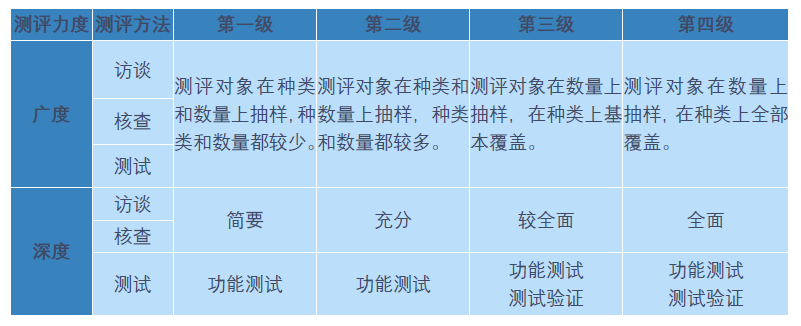 《测评要求》对不同安全保护等级的测评力度有不同要求,这主要体现在测评工作的广度和深度上。安全保护等级越高,测评广度就越大,深度就越深。其中,所谓测评广度越大,指的是测评需要在更多细节上开展,测试要求也更严格。所谓测评深度越广,指的是测评实施包含的测评对象更多。具体来说:
