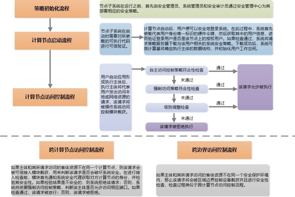首先,根据“一个中心”管理下的“三重防护”系统要求,第三级系统安全保护环境应分为四个部分,分别为:安全管理中心、安全计算环境、安全区域边界以及安全通信网络。其次,每个部分下又由一个或若干个子系统[3]组成。最后,《设计技术要求》从安全管理流程与访问控制流程角度对子系统策略初始化流程、计算节点启动流程、计算节点访问控制流程、跨计算节点访问控制流程以及跨边界访问控制流程等主要流程做出了要求,具体要求如下: