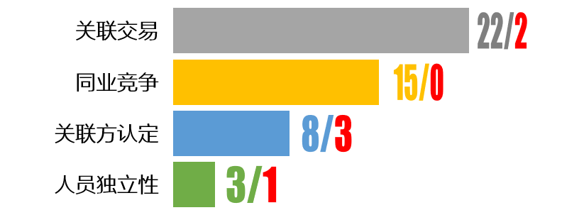 我们将关联方认定单独做了统计,是因为虽然从法律和财务的角度对于关联方均有比较明确的定义,但在认定关联方时常常会提到一个很重要的原则叫做“实质重于形式”,往往与其配套出现的发审会问题是是否存在关联方“非关联化”。因此,某个主体是否是拟上市企业的关联方,并不完全取决于它与企业的关系能否落到某条关联方的定义上,而是看它和企业的关系是否“清白”到足够排除审核部门的合理怀疑。不管是贝斯美转让宁波千衍的股权、宇瞳光学的供应商持有公司的股份,还是西安瑞联的外协加工商被详细询问,发审委委员表面上怀疑的虽然是关联方认定,实质上担心的往往还是关联交易和同业竞争问题。