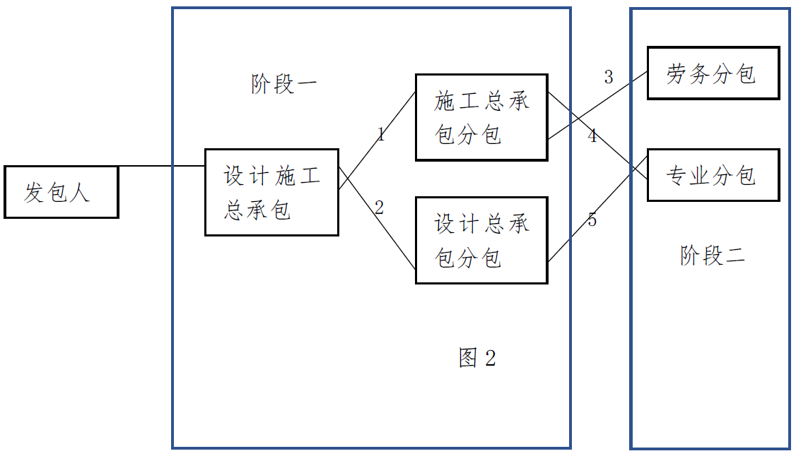 按照该意见,图2阶段一中(1.2)设计施工总承包单位对于自己不具有资质的设计或施工部分可以择优分包给具有相应资质的企业属于合法转包行为。