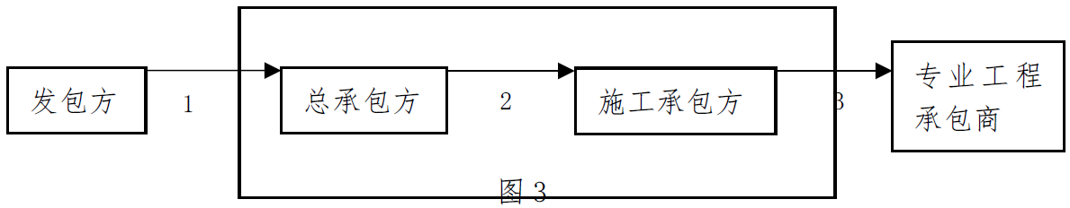 以本图为例,若总承包方为具有施工资质的总承包商,自行进行项目施工,则总承包商与施工承包方实际为一个主体,标号为3的专业分包行为与图1中标号为1的专业工程分包行为无论从外在表现形式上还是从法律后果上均一致,应当属于合法的转包行为。