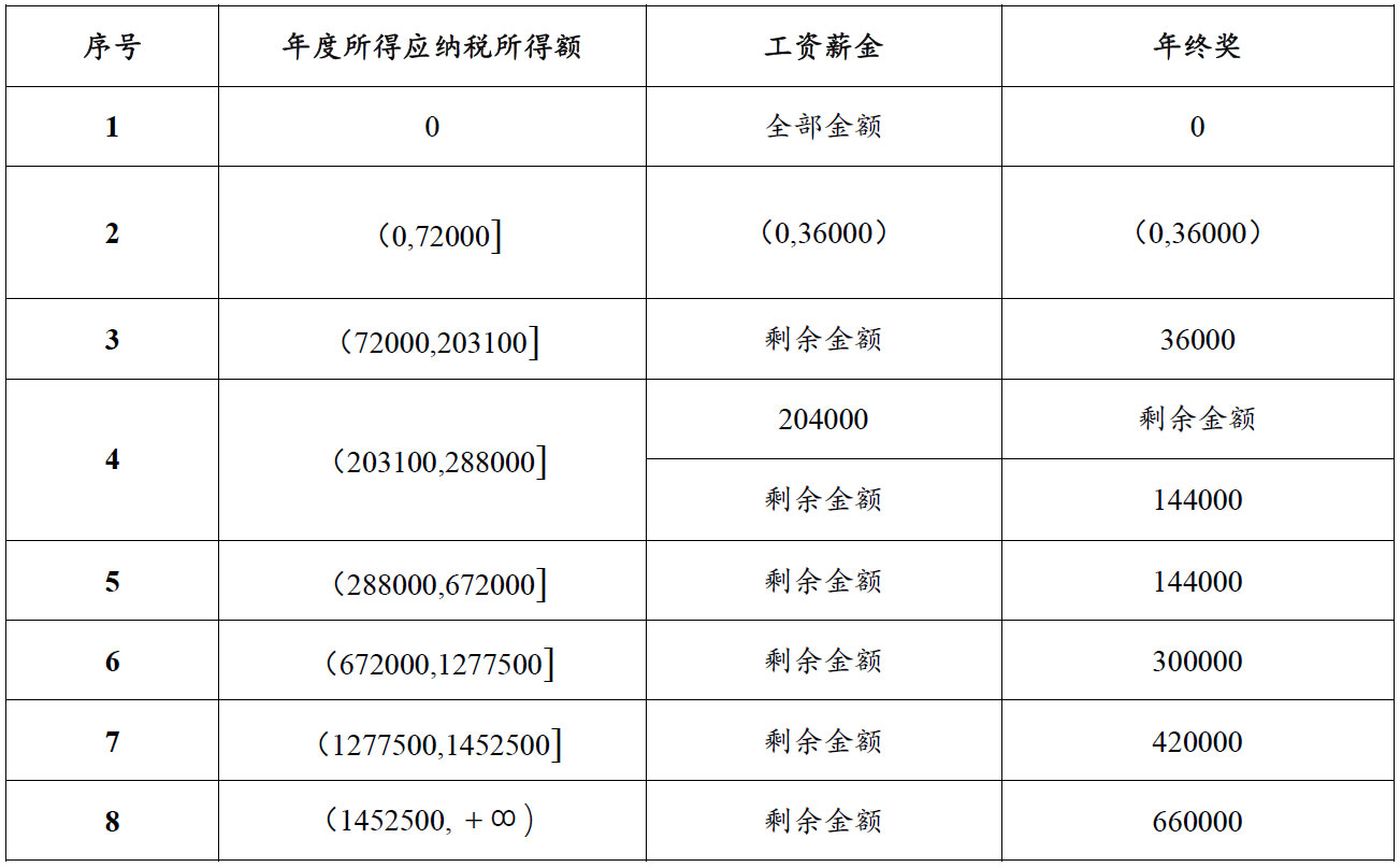 经过测算,在给定年度所得应纳税所得额的前提下,年终奖的最优筹划方案如下:
