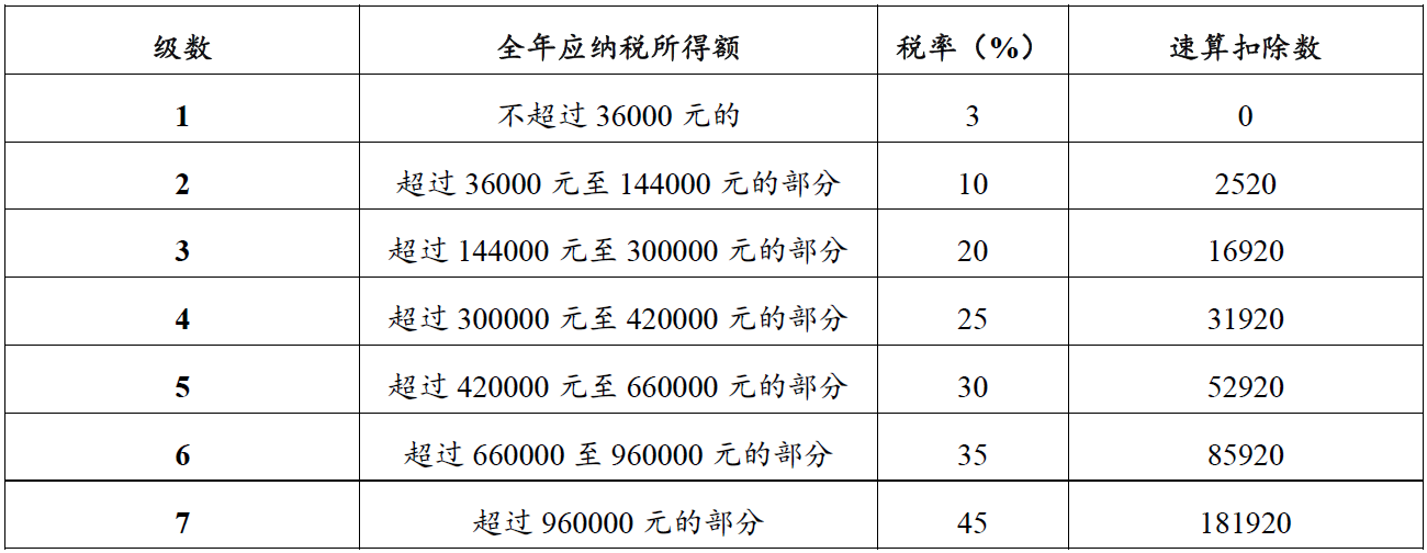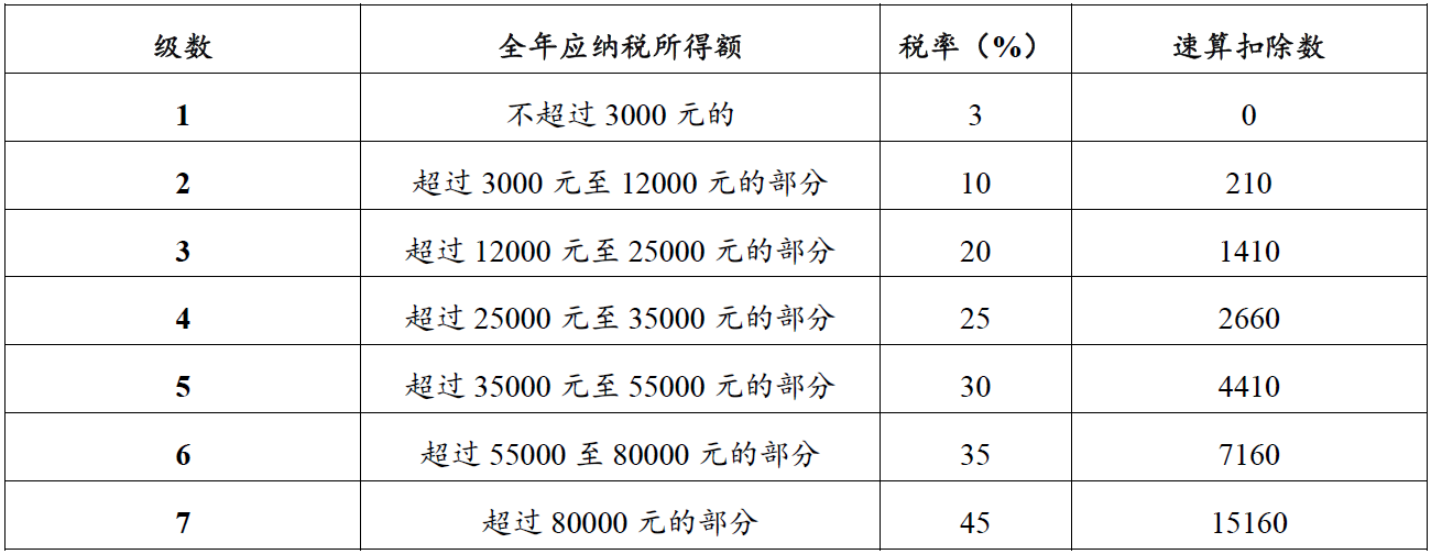 方式二:在2021年12月31日前,可选择将年终奖不并入当年综合所得,以全年一次性奖金收入除以12个月得到的数额,按照附件二所列的按月换算后的综合所得税率表,确定适用税率和速算扣除数,单独计算纳税。计算公式为: