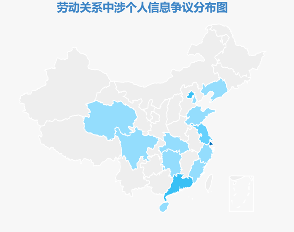从涉案的地域范围来看,涉及员工个人信息的劳动争议集中发生在上海(40.24%)、广州(14.63%)、北京(13.41%)江苏(8.54%)、浙江(4.88%)等经济较发达的地区。笔者认为,形成该分布态势的原因主要有:一是上述地区企业的发展程度较高,较为重视企业文化建设,对员工的诚信程度要求更高;二是上述地区的员工具有更强烈的维权意识和个人信息保护意识,也更倾向于挑战用人单位的管理权威及其收集、使用个人信息的行为(如从根源上质疑用人单位收集相关信息的合理性和必要性等)。