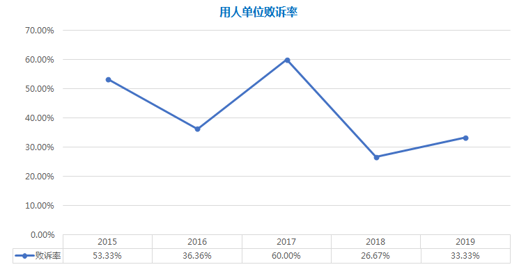 从用人单位的败诉率来看,近五年来,用人单位在相关案件中的败诉率波动回落,目前已从峰值60%(2017年)下降至33.33%(2019年)。可见,相较于一般的劳动合同解除争议,用人单位在涉及个人信息案件中的败诉率相对较低。
