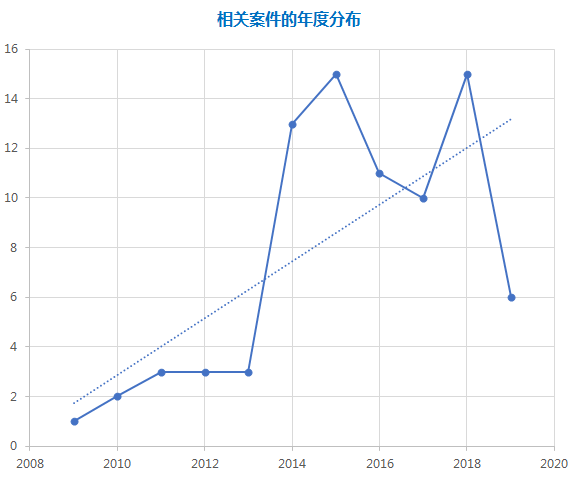 从案件的年度分布来看,相关案件整体呈逐年增长的趋势。2013年以前(含当年),每年涉及个人信息的劳动争议案件的数量均低于4件;2014年,相关案件数量增长至13件,较2013年增长了约300%;2018年,相关案件数量较2014年增长了15%。