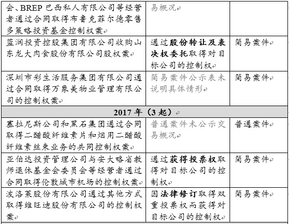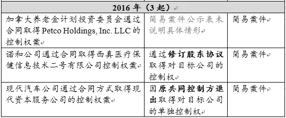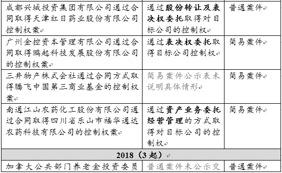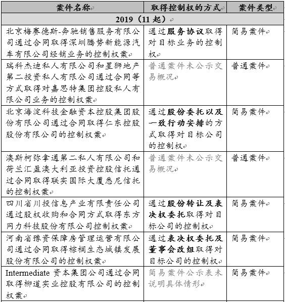 从目前有限的通过合同或其他方式取得控制权的申报实例来看,取得控制权的典型交易类型有以下几类: