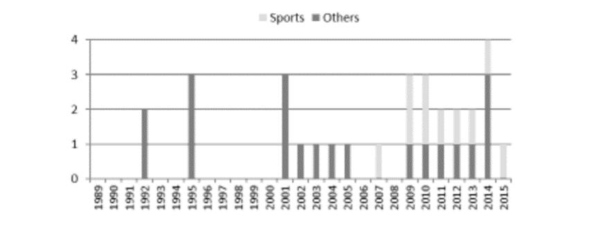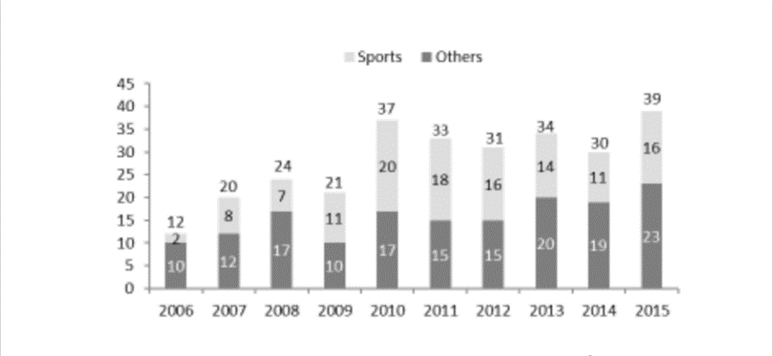 把时间拉回到近一些,2006年至2015年间,共有281个申请撤销仲裁裁决的上诉案,其中裁决为体育仲裁裁决的有123个。