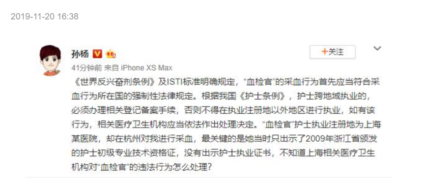 之所以仲裁庭这里要考虑中国法,是因为DC规则Annex E第E.4.1条规定:“如果当地有关医疗保健环境之标准与法规要求高于本条下述规定,则采血程序应当与当地标准与法规要求相一致”。所以在采血程序问题上,中国法的规定有重要意义。孙杨专门请了中国法专家证人到庭,WADA律师布伦特问了他一系列与护士执业相关的中国法问题。