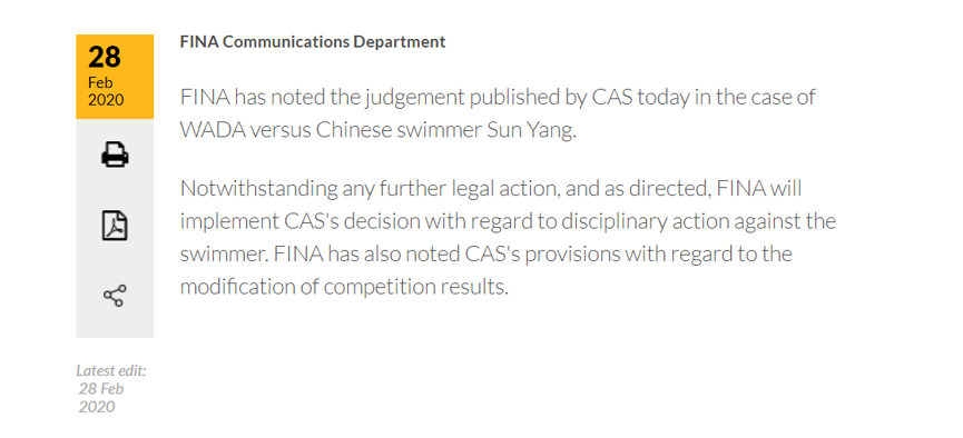 是的。CAS裁决是终局裁决,裁决通知到当事人之后将立即生效。国际泳联在2020年2月28日已经发布公告,明确其会立即执行CAS裁决,而无论各方后续还有权采取什么法律行动。