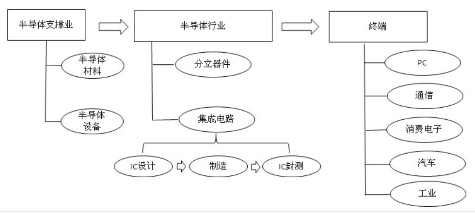 半导体行业的产业链如下图所示,其中中游按照制造技术分为分立器件和集成电路。集成电路(IC)占到半导体总产值的80%以上,是半导体产业最重要的组成部分。
