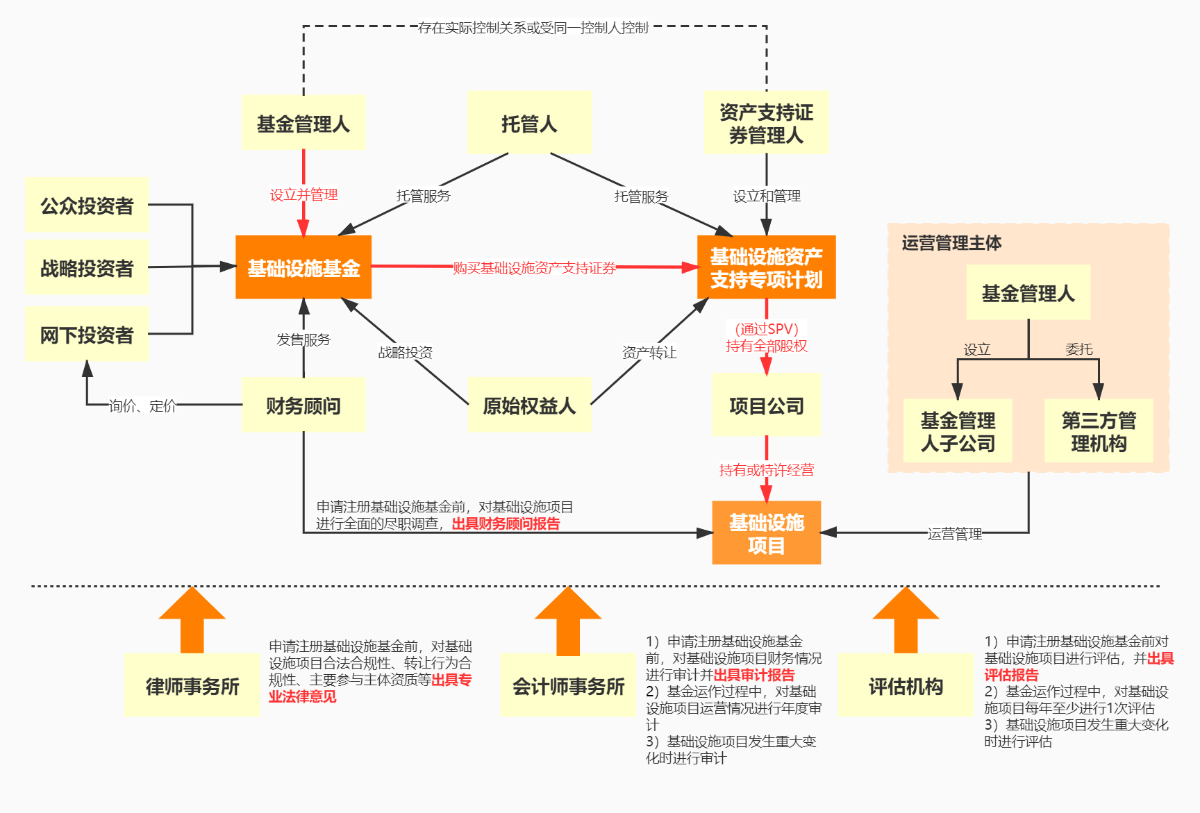 结合《指引》中规定的交易结构,发行基础设施REITs涉及的各参与方的具体关系如下: