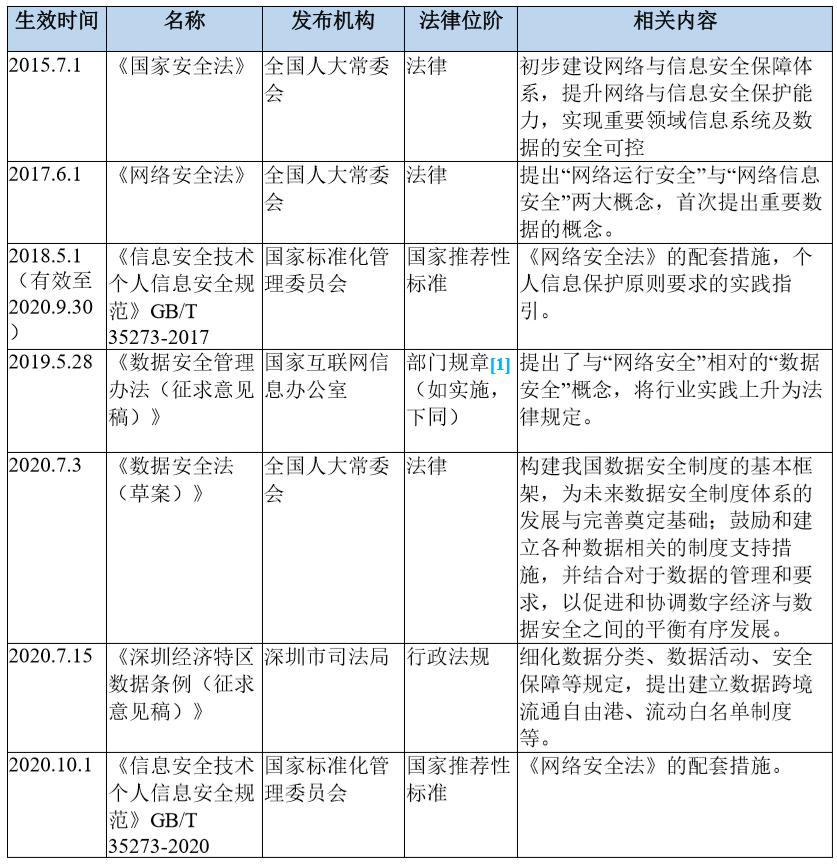 在这种时代背景下,近年来我国不断出台法律、法规和相关政策,旨在加快数据安全法规制度建设,制定数据资源确权、开放、流通、交易等相关制度,以期完善数据产权保护制度并加大对技术专利、数字版权、数字内容产品及隐私等的保护力度,并确立了数据作为新生产要素的地位。2020年7月,《中华人民共和国数据安全法(草案)》(“数据安全法”) 公布并征求意见。数据安全法为我国未来数据安全保护方面的主要制度框架描绘了宏伟蓝图,也对企业的数据活动在内控和合规等多方面提出了新的要求。本文旨在梳理数据安全立法的演变,总结数据安全法对金融机构的影响,并根据笔者多年从事金融法律服务的经验,解读我国现行法律体系下金融机构开展数据业务在合规方面的相关建议,以及由此带来的启迪。