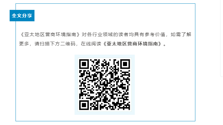 近日,国际律师协会(International Bar Association, IBA)亚太区域论坛(Asia Pacific Regional Forum)出版了第一版全英文的《亚太地区营商环境指南》(Doing Business in Asia Pacific)。《亚太地区营商环境指南》从商业环境、商业和公司结构、并购、外商投资、破产重组、就业和劳动、产业关系、工作健康和安全、税法、知识产权、融资、隐私与数据保护、竞争法及争议解决等方面,全面介绍了中国、中国香港特别行政区、澳大利亚、印度、印度尼西亚、日本、马来西亚、菲律宾、新加坡、韩国和越南等11个亚太地区和国家的营商环境。《亚太地区营商环境指南》凝聚了该等司法区域法律专家的专业知识和实践经验,是外国投资者和法律专业人士了解前述国家和地区营商环境的第一站。